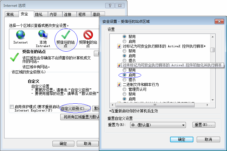 2.设置IE的Internet选项,在其“安全”选项卡中,点击“自定义级别(针对受信任的站点区域)”,设置“对未标记为可安全执行脚本的ActiveX 控件初始化并执行脚本”之选项为“启用”(原为禁用),如图2所示。