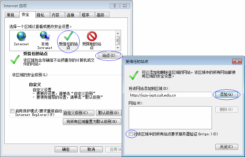 再点击“受信任的站点”右边的“站点”按钮,将“http://jszx-jxpt.cuit.edu.cn”添加到其网站列表中,如图3所示——注意,在图3中添加前应去掉勾选“对该区域中的所有站点要求服务器验证(https:)”。